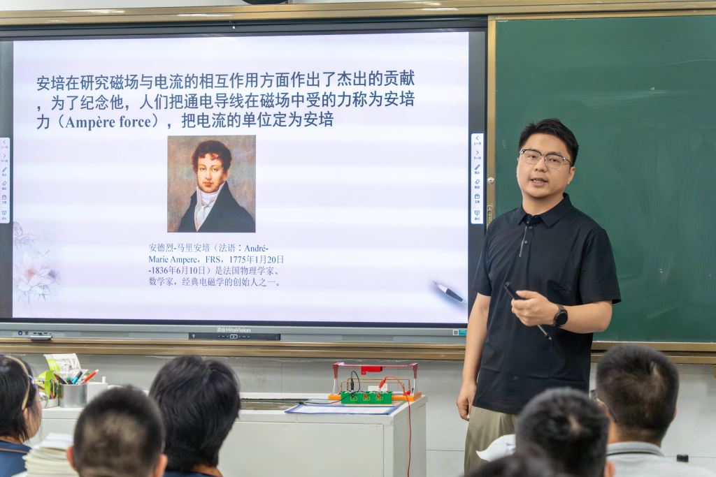 物理课堂上,杨海老师的《正则动量》从特殊到一般、从具体到抽象的认知规律,成功地为学有余力的学生打开了分析力学的一扇窗,学生们在老师的启发下,积极探索物理规律;孙毓斌老师的《磁场对通电导线的作用力》用直观的实验演示,成功地将理论分析、实验探究与生活应用相结合,达成了知识、能力和素养的教学目标。化学课堂上,沈叶亚老师从著名的“水滴实验”和“水桥实验”引入,一步步带领学生探索水电离的奥秘,学生们被有趣的实验现象所吸引,积极参与到探究中;赵王峰老师运用独创的“双手定则”来帮助学生理解吉布斯自由能的运用,学生们在老师的指导下,逐渐掌握了这一抽象概念,思维得到了拓展。