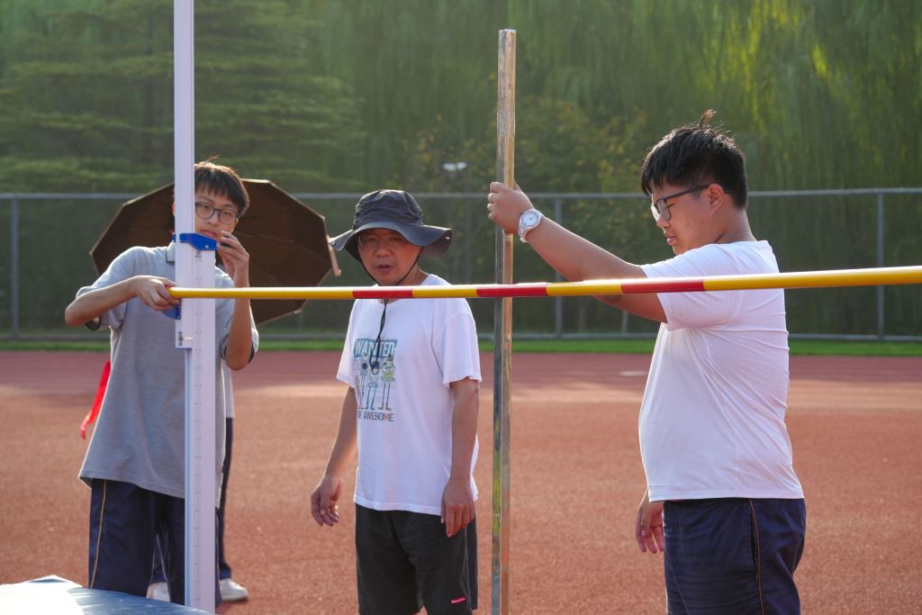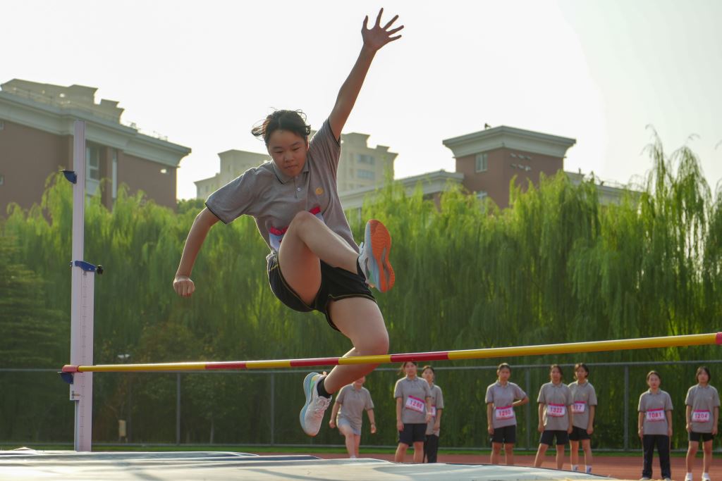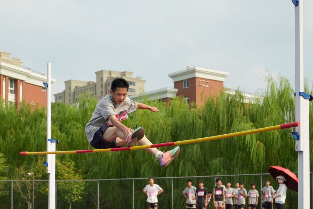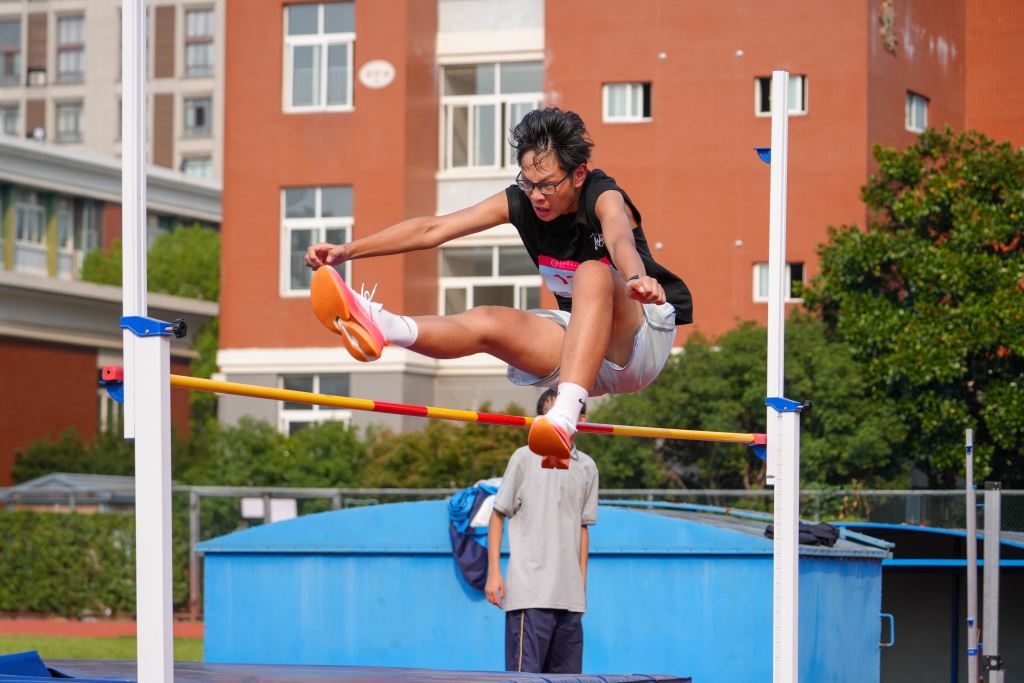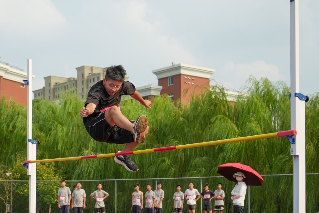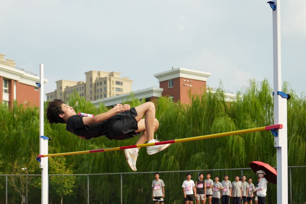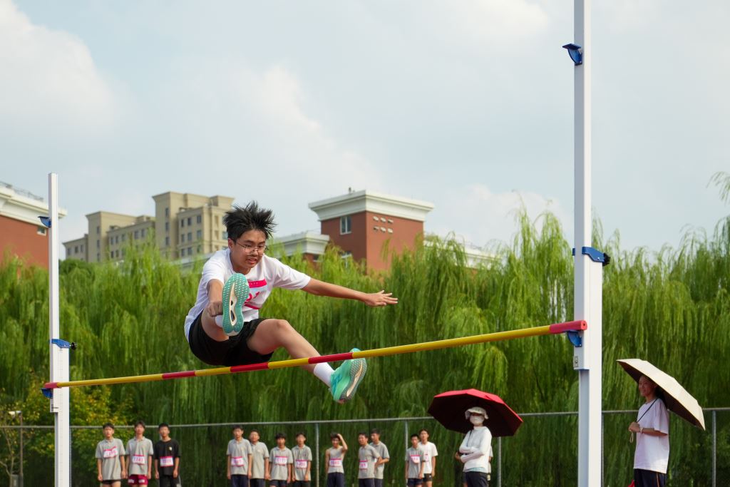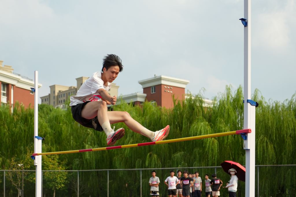 跳高场地就像一个魔法舞台,选手们如同拥有超能力的飞侠。看!这位同学助跑、起跳,像一只矫健的雄鹰,轻盈地越过横杆,在空中划出一道完美的弧线。横杆不断升高,挑战也越来越大,但我们的选手毫不畏惧,一次次挑战自我极限。每一次成功越过,现场都会爆发出一阵热烈的欢呼声,仿佛在为勇士们奏响胜利的凯歌。