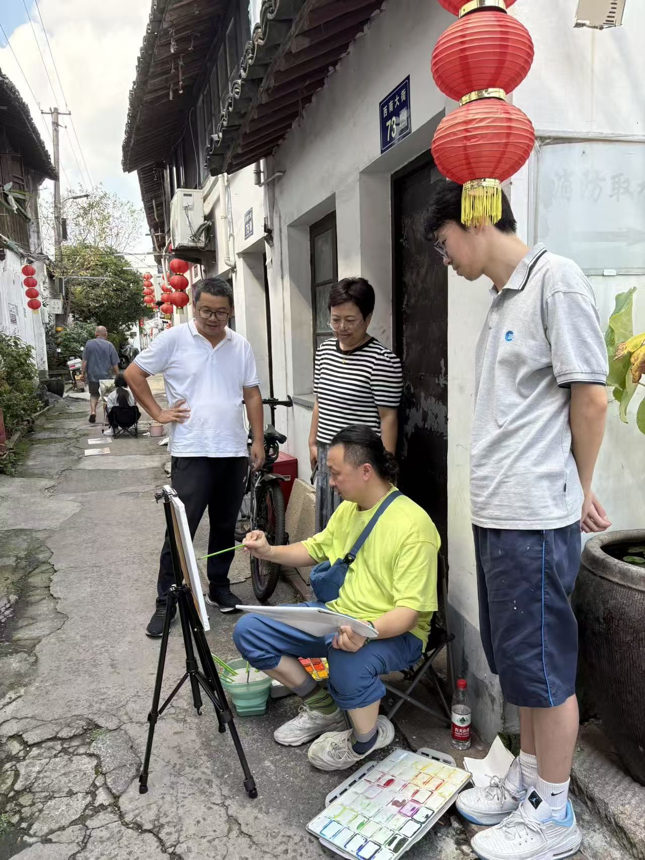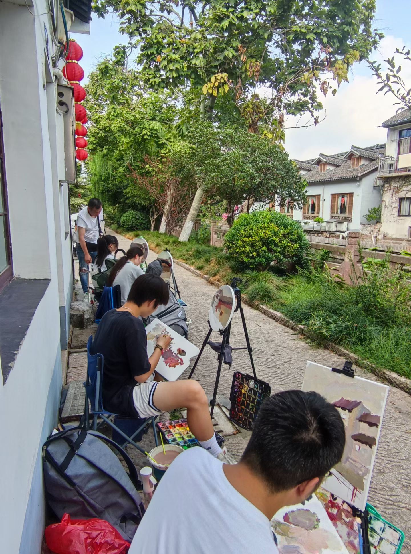 写生期间,同学们执笔取景,散落在古镇的各个角落。有人穿行于幽深古巷,有人驻足于黛瓦粉墙,也有人凝神于桥影流水。他们以目光捕捉古镇韵味,以画笔勾勒人间烟火。片刻之间,新塍古镇的静美与生机,便在画纸上一一苏醒,被赋予全新的艺术生命。