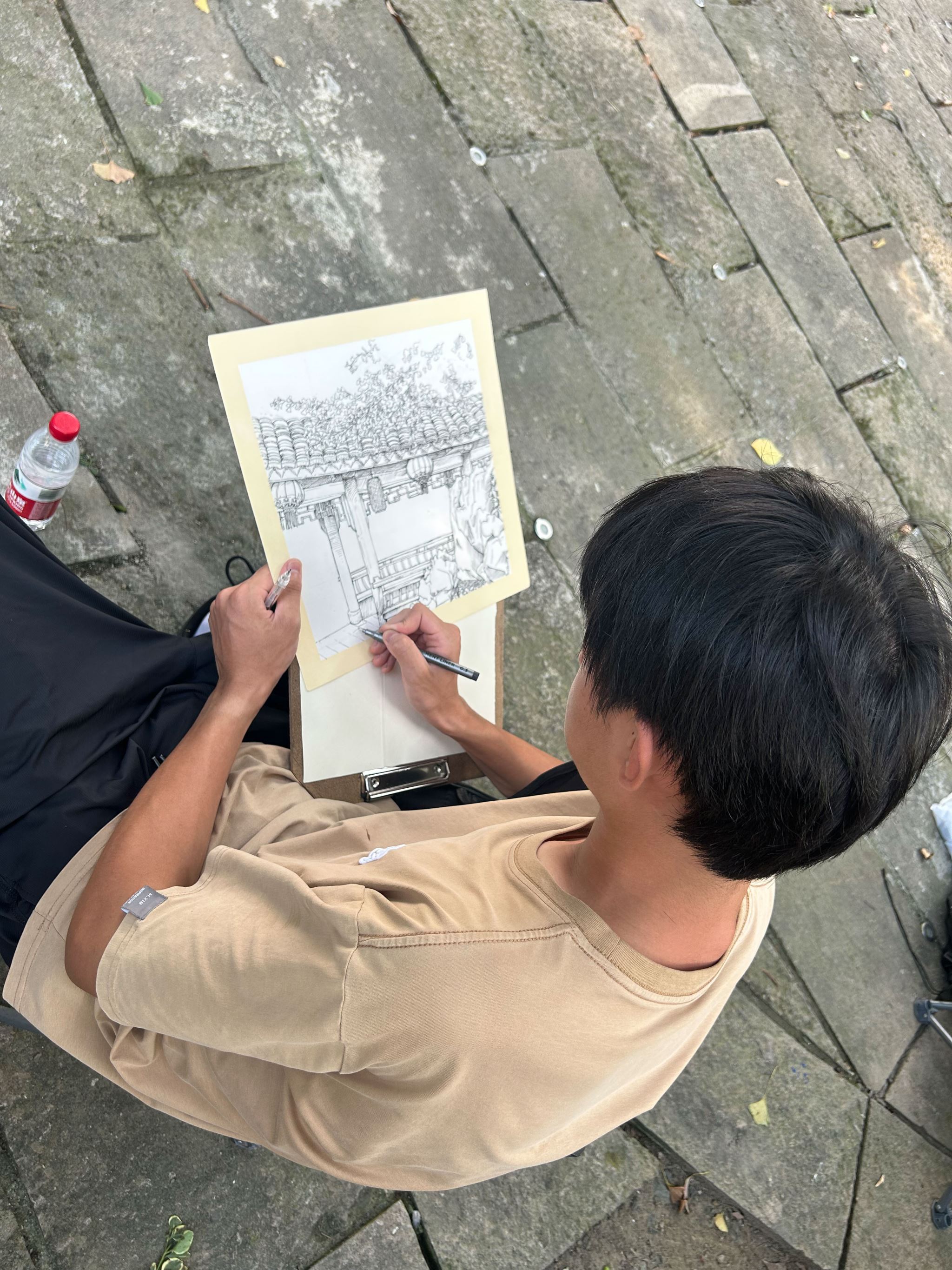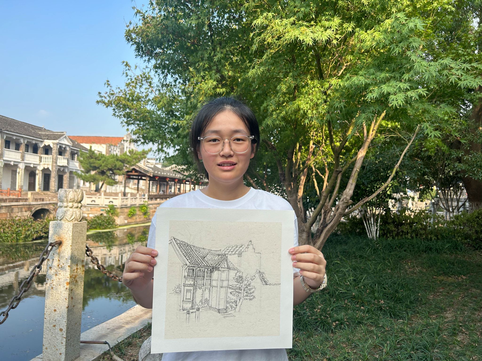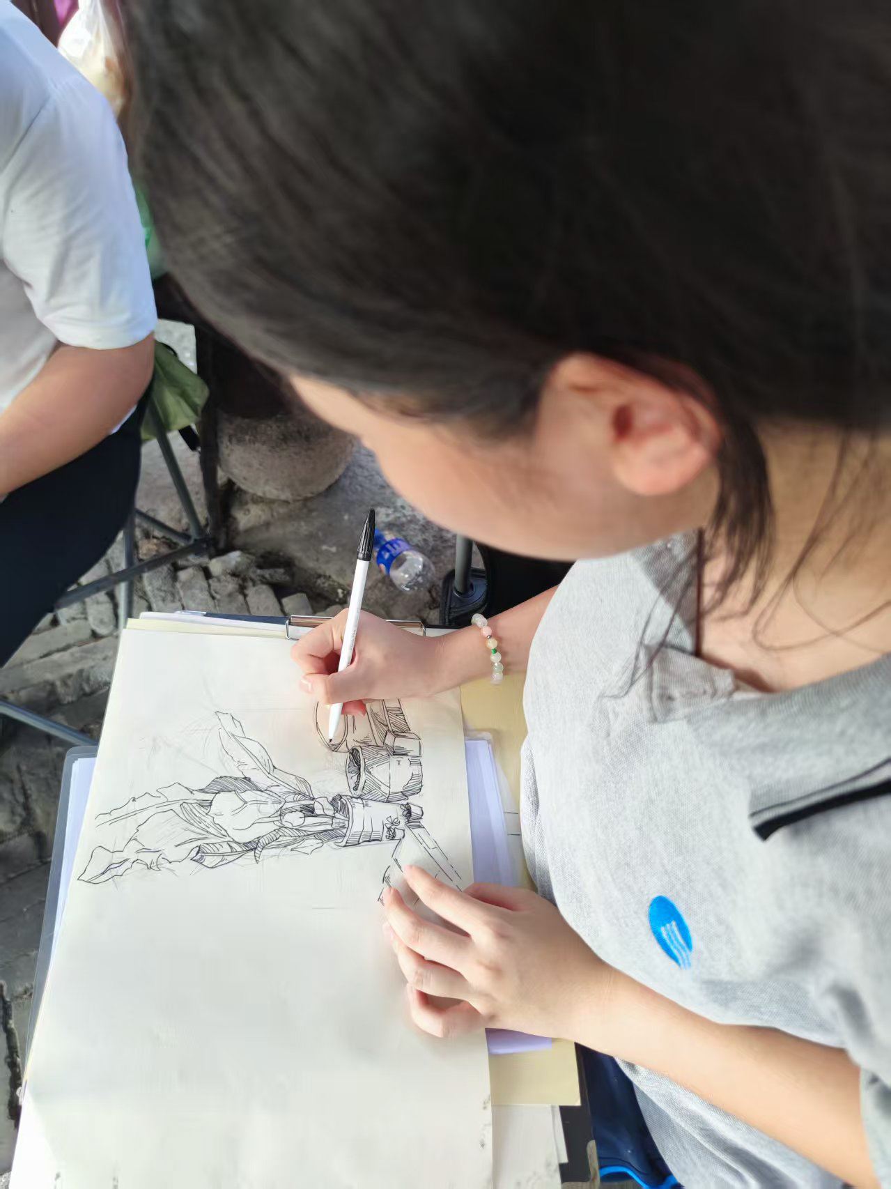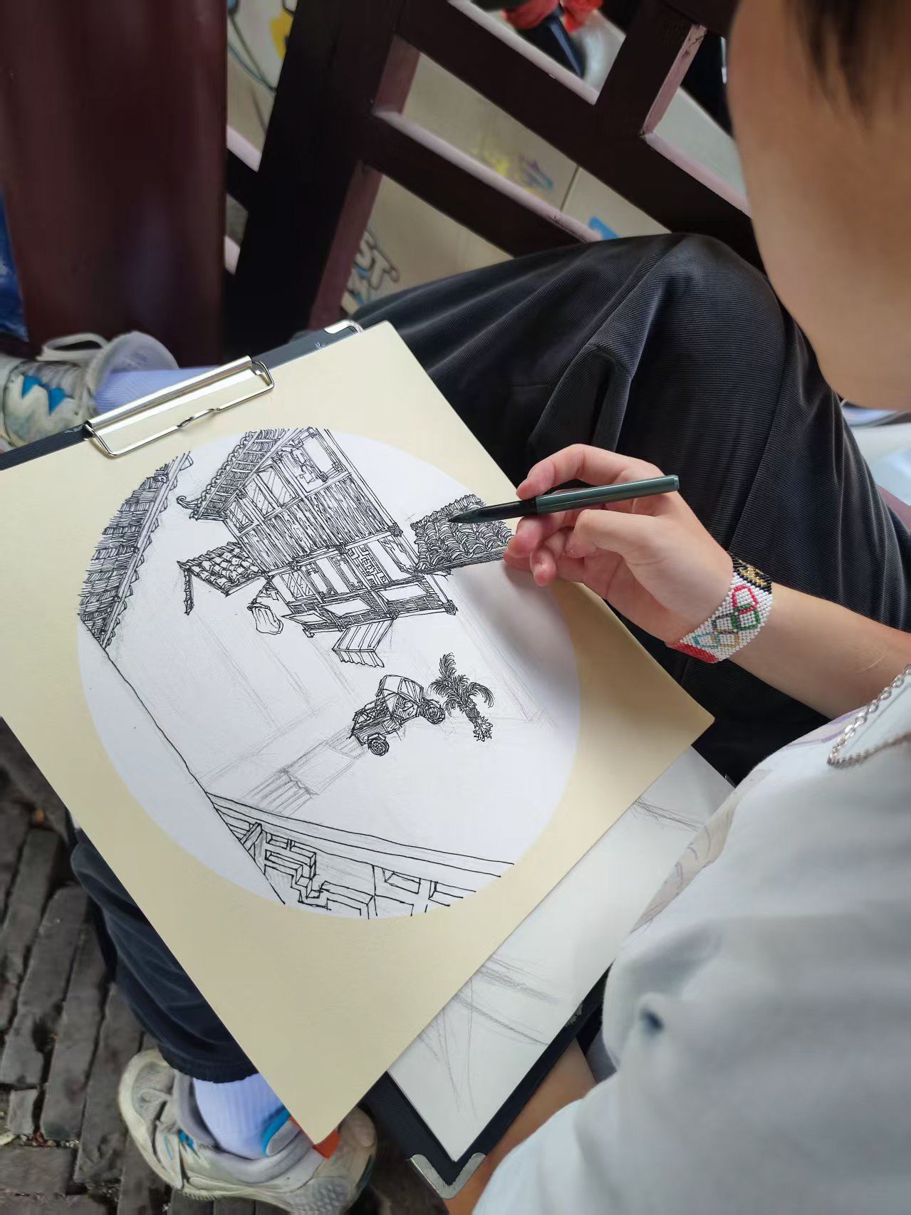 铺开画纸,削尖铅笔,少年们瞬间进入专注状态。烈日逐渐升高,汗水浸湿了额发与衣衫,却丝毫未影响他们的专注。有人不时起身退后,观察画面的整体构图;有人俯身细描,调整细节刻画的力度;遇到瓶颈时,便主动向老师请教,在老师“注意画面节奏感,让主体景物线条更实,配景线条稍虚”的点拨下,迅速找到突破方向。笔尖在画纸上不停游走,一屋、一墙、一亭、一树、一花、一草皆跃然纸上,每一道线条都饱含着同学们对美术的热爱与对古镇的深情。夕阳西下,画纸上的古镇渐渐鲜活:或浓或淡的线条里,藏着古桥的庄重、老屋的温情,也藏着少年们专注的眼神与执着的热爱。