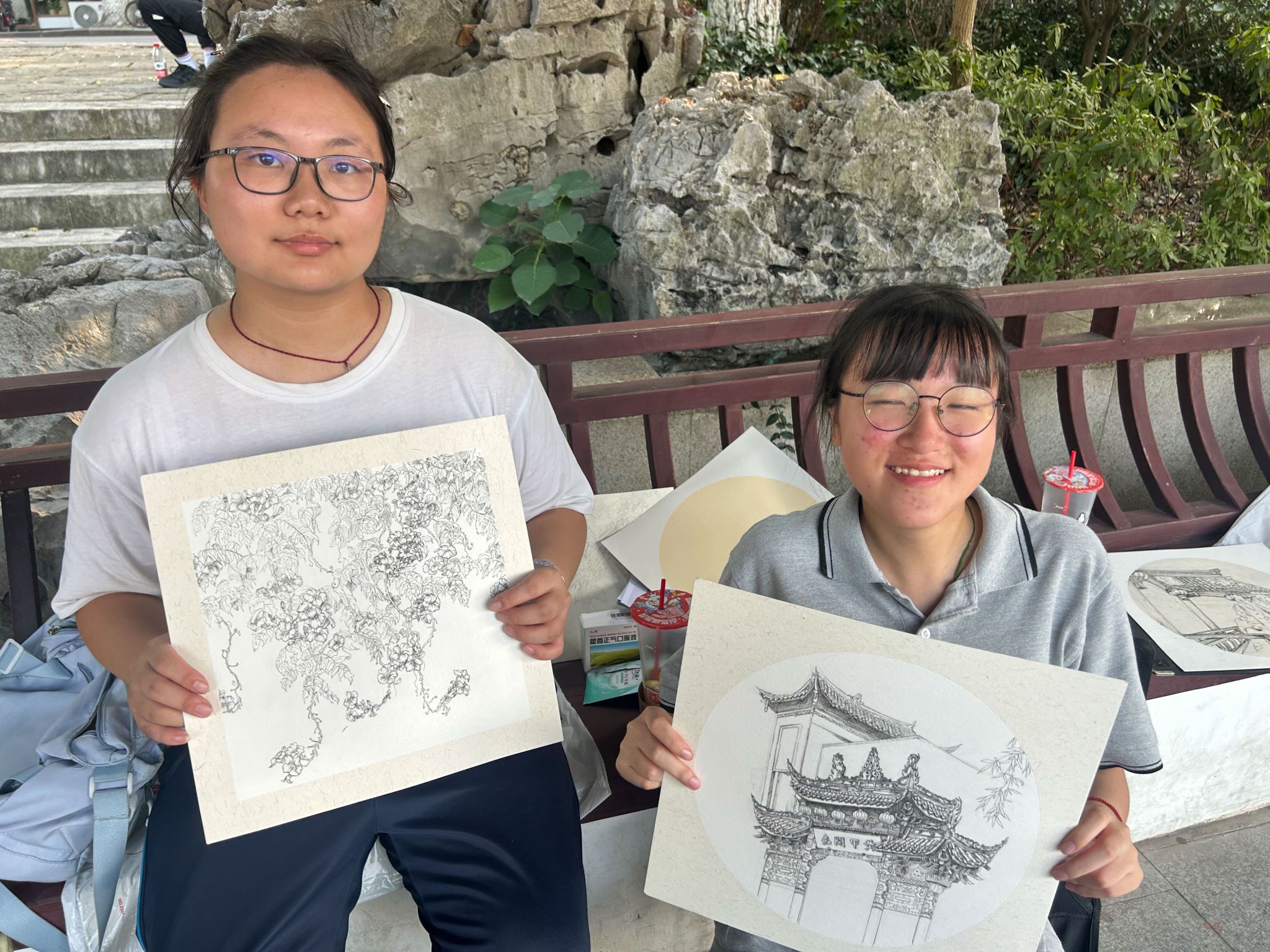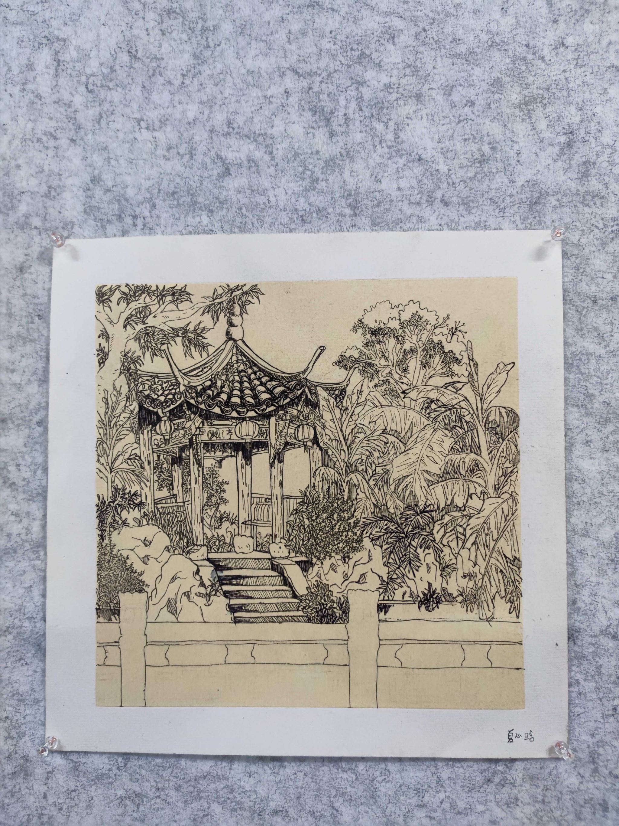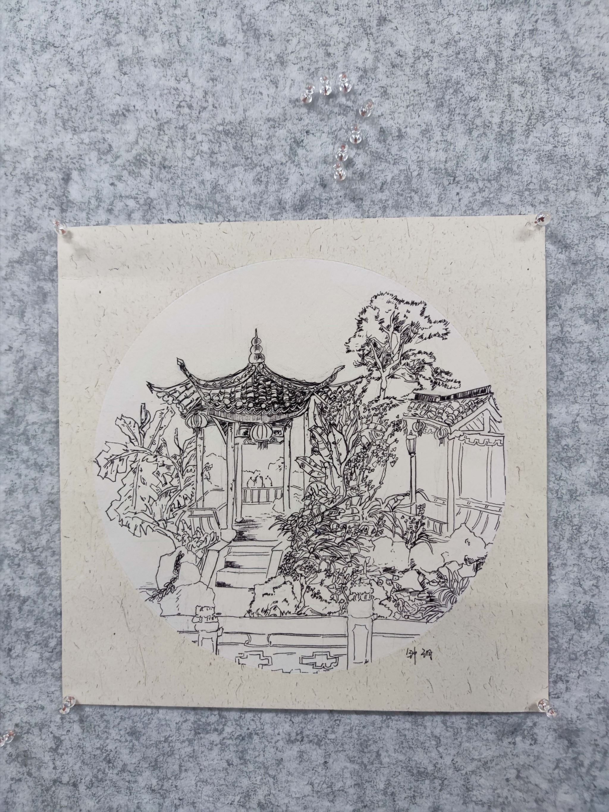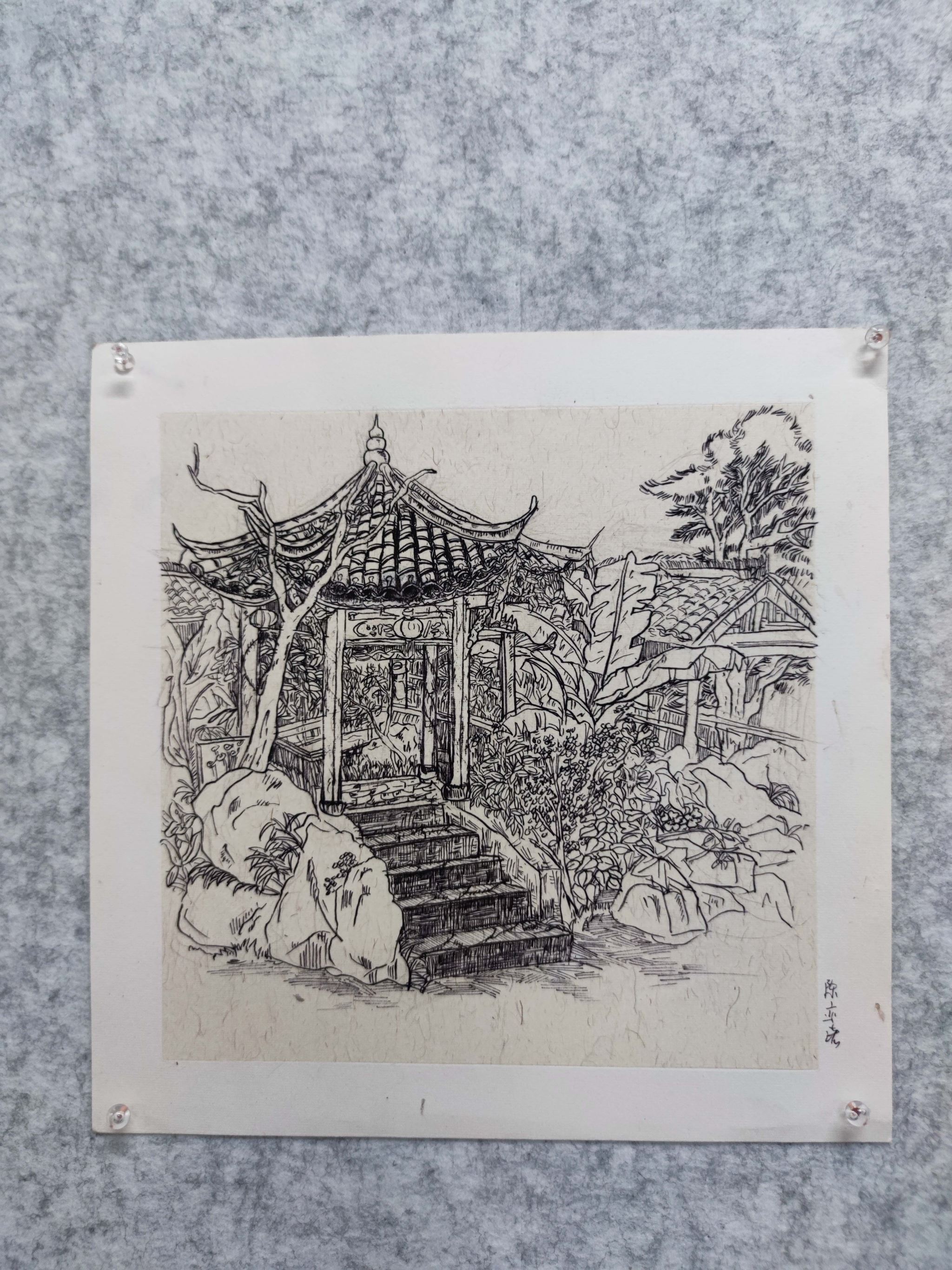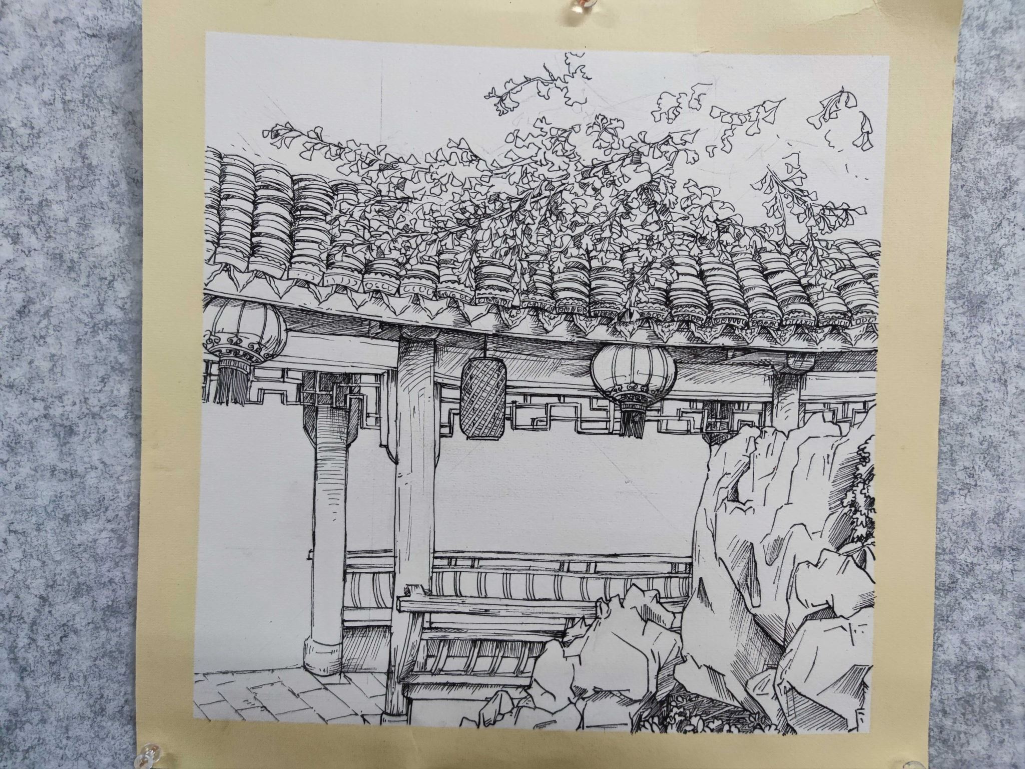 铺开画纸,削尖铅笔,少年们瞬间进入专注状态。烈日逐渐升高,汗水浸湿了额发与衣衫,却丝毫未影响他们的专注。有人不时起身退后,观察画面的整体构图;有人俯身细描,调整细节刻画的力度;遇到瓶颈时,便主动向老师请教,在老师“注意画面节奏感,让主体景物线条更实,配景线条稍虚”的点拨下,迅速找到突破方向。笔尖在画纸上不停游走,一屋、一墙、一亭、一树、一花、一草皆跃然纸上,每一道线条都饱含着同学们对美术的热爱与对古镇的深情。夕阳西下,画纸上的古镇渐渐鲜活:或浓或淡的线条里,藏着古桥的庄重、老屋的温情,也藏着少年们专注的眼神与执着的热爱。