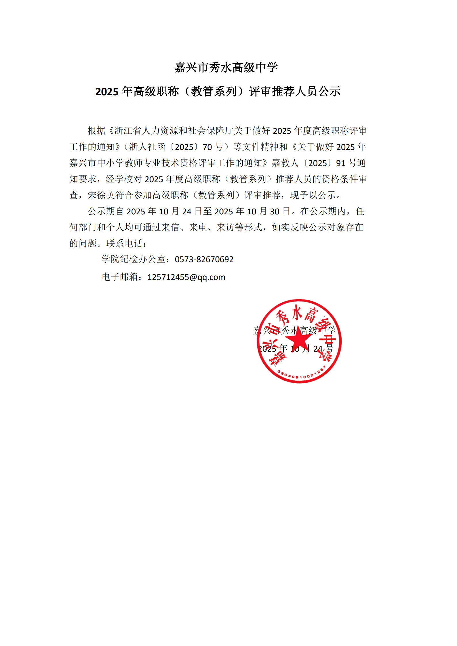 嘉兴市秀水高级中学2025年高级职称(教管系列)评审推荐人员公示 - 通知公告 - 嘉兴市秀水高级中学
