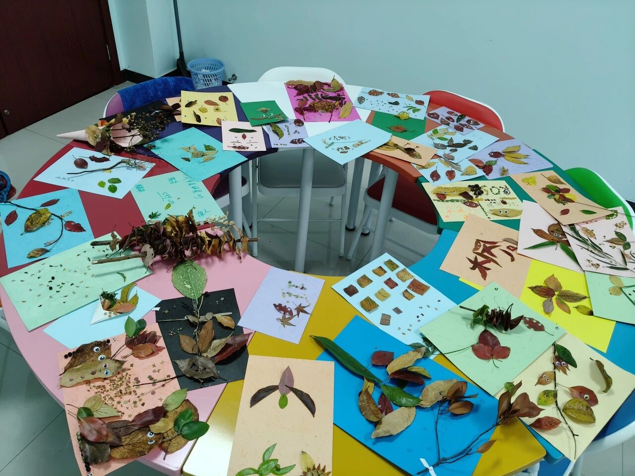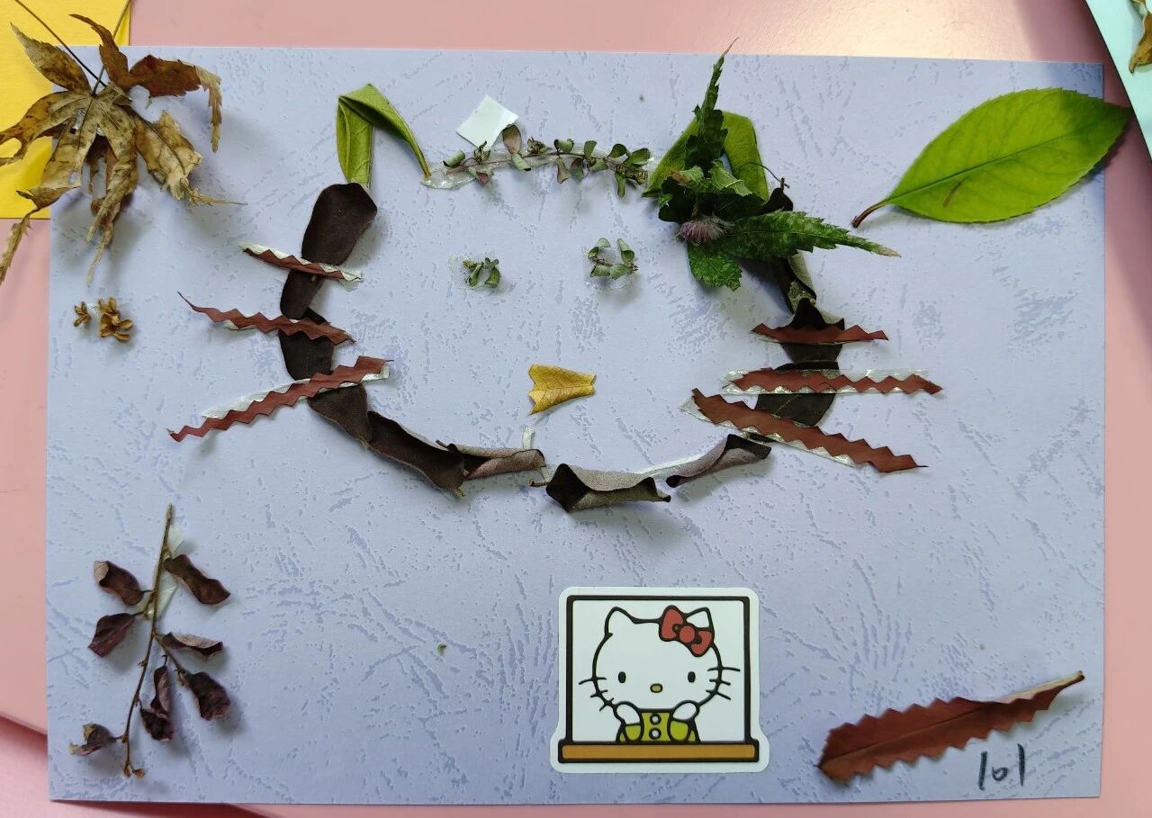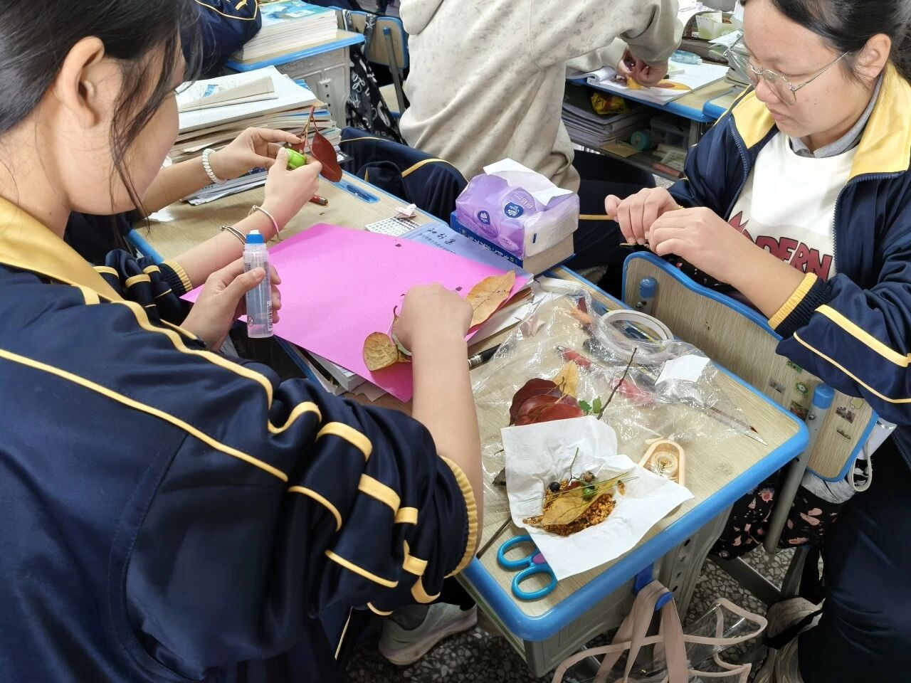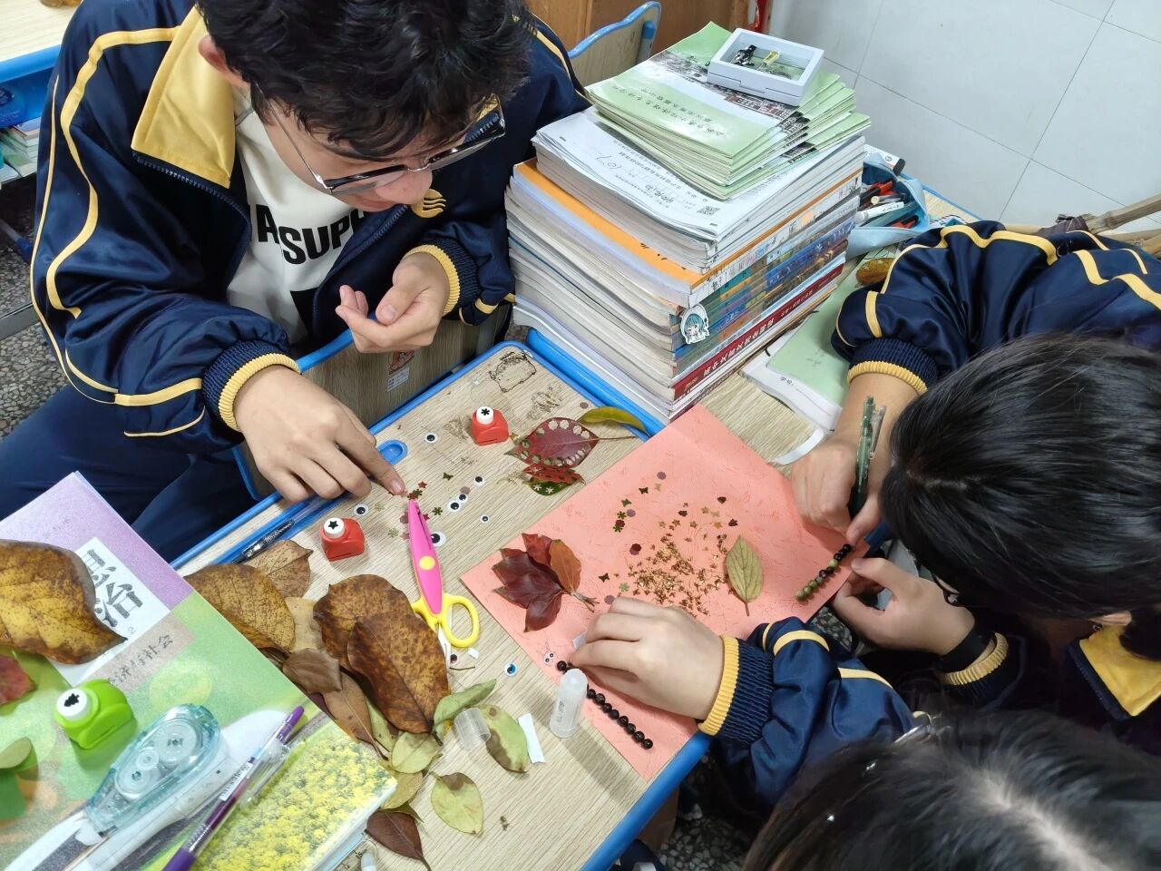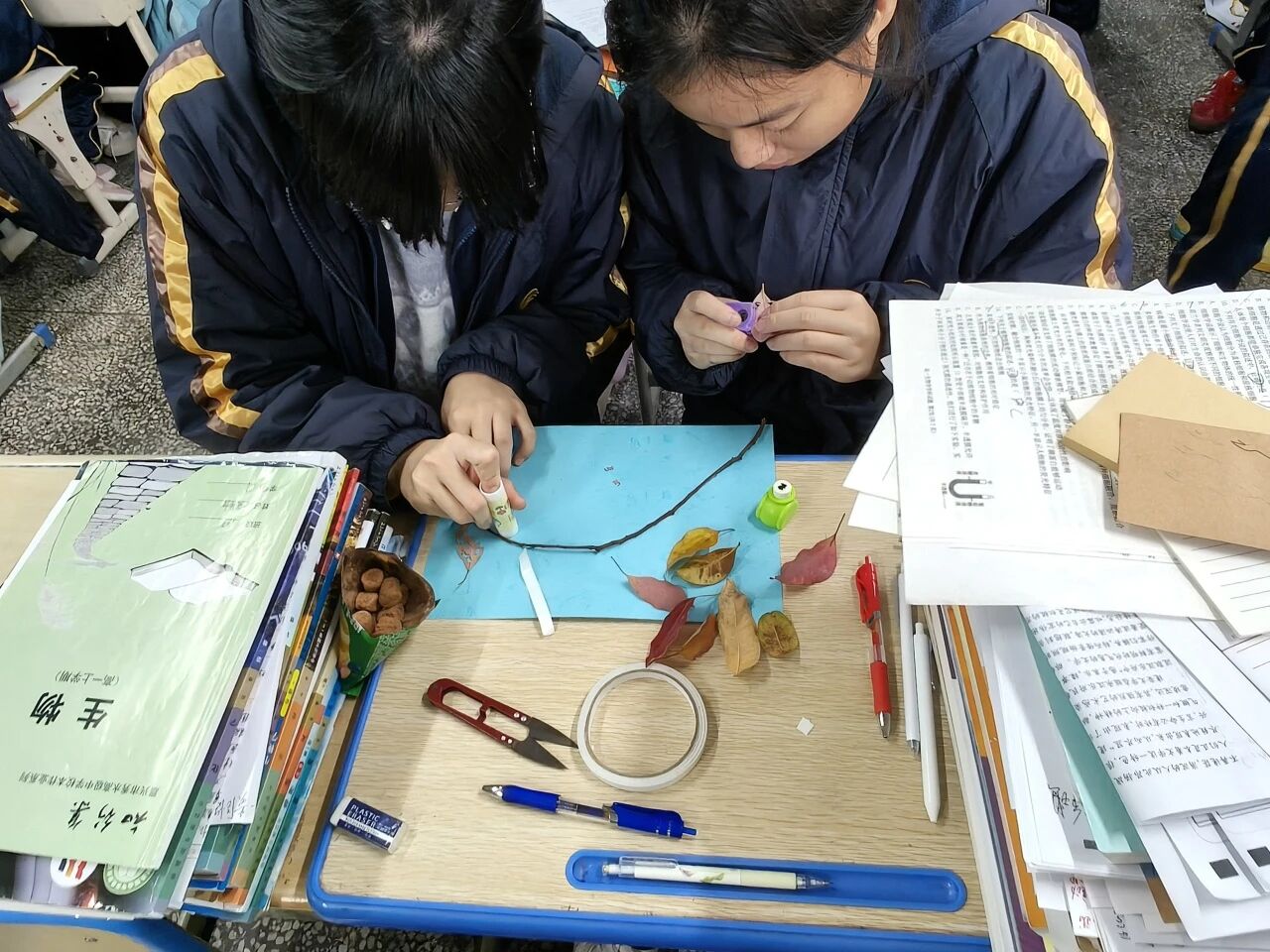 活动聚焦学生心理健康与全面发展需求,分阶段有序推进。活动伊始,通过简短的感官冥想环节引导学生沉静身心——伴着轻柔音乐,同学们闭眼感受秋风触感、落叶声响与空气里的秋意,在慢节奏中拉近与自然的距离,为后续实践奠定情感基础。随后的“寻秋·自然收藏家”环节,学生以小组为单位在指定区域内捡拾秋叶、枝丫、果实等自然物,全程严守“只拾不摘、有序轻行”约定,在弯腰俯身间培养观察力与文明素养,收获发现自然之美的乐趣。返回教室后,各小组将收集的素材进行拼贴创作,用斑斓秋叶、错落枝丫搭配创意构思,诠释对秋天的感悟:有的作品展现“秋日盛景”传递对自然的赞叹,有的以枝丫配文字写下“沉淀成长”的感悟,有的融入创意寄托生活期许。创作过程中,学生分工协作、分享想法,在交流中增进默契,有效释放学习压力。