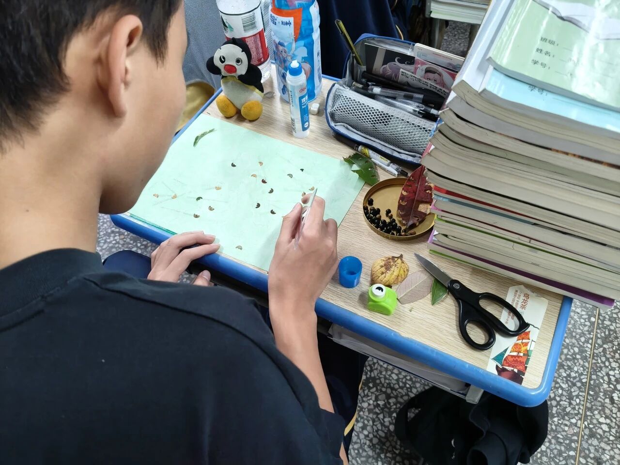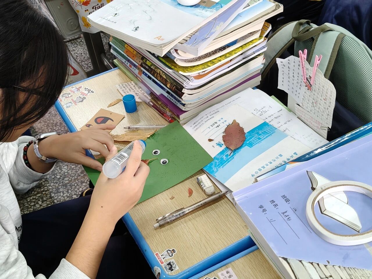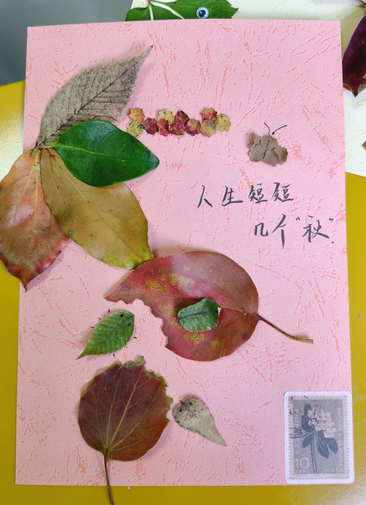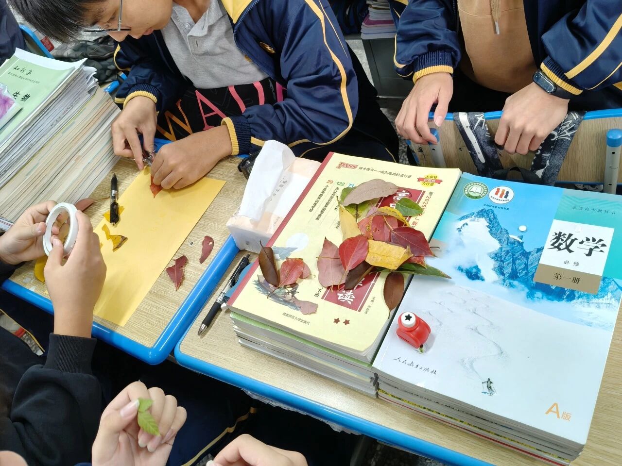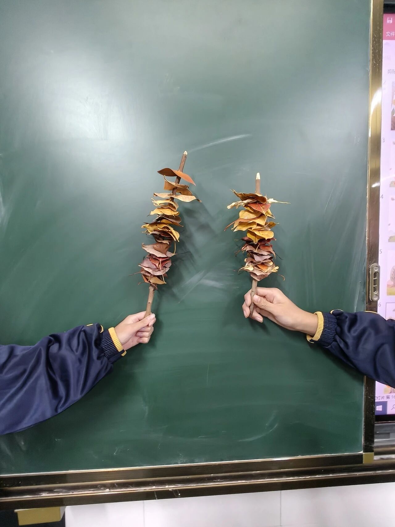 活动聚焦学生心理健康与全面发展需求,分阶段有序推进。活动伊始,通过简短的感官冥想环节引导学生沉静身心——伴着轻柔音乐,同学们闭眼感受秋风触感、落叶声响与空气里的秋意,在慢节奏中拉近与自然的距离,为后续实践奠定情感基础。随后的“寻秋·自然收藏家”环节,学生以小组为单位在指定区域内捡拾秋叶、枝丫、果实等自然物,全程严守“只拾不摘、有序轻行”约定,在弯腰俯身间培养观察力与文明素养,收获发现自然之美的乐趣。返回教室后,各小组将收集的素材进行拼贴创作,用斑斓秋叶、错落枝丫搭配创意构思,诠释对秋天的感悟:有的作品展现“秋日盛景”传递对自然的赞叹,有的以枝丫配文字写下“沉淀成长”的感悟,有的融入创意寄托生活期许。创作过程中,学生分工协作、分享想法,在交流中增进默契,有效释放学习压力。