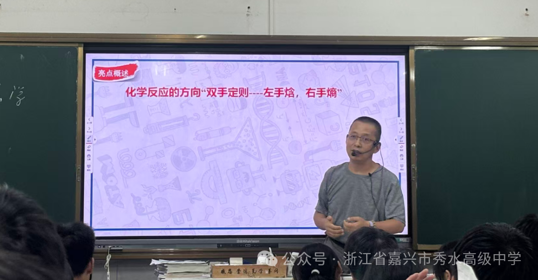 高二年级的两位老师则分别围绕《水的电离和溶液的pH》与《化学反应进行的方向》展开教学。沈叶亚老师从“水是否电离”这一认知冲突出发,借助实验测定、数据分析(Kw)、能量变化分析,引导学生深入理解水的微弱电离本质及离子积概念,并通过“虹鳟鱼生存”等真实情境问题,探讨外界条件对水电离的调控及其应用,培养学生的变化观念与平衡思想。