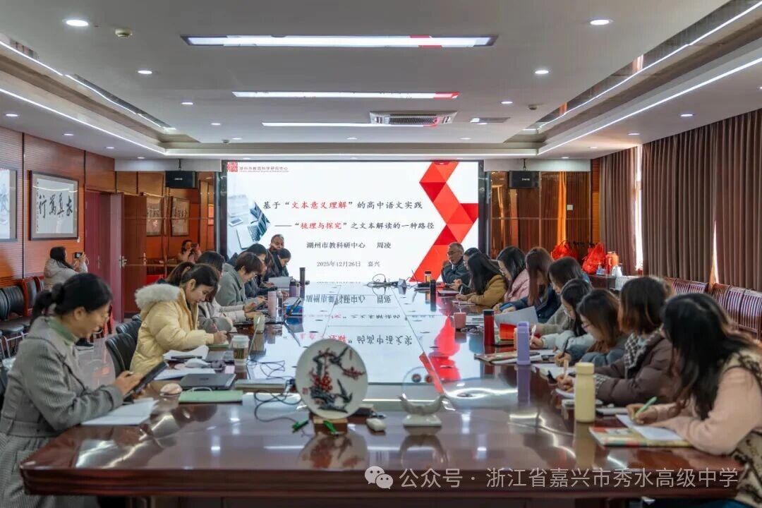 为进一步落实新课标理念,强化新教材教学与新高考研究,促进课堂教学转型,12月26日,嘉兴市本级高中语文“学科中心组”集中活动在嘉兴市秀水高级中学举行。本次活动特邀湖州市教研员、正高级教师、特级教师周凌莅临指导,并作专家主题讲座。活动由嘉兴市本级高中语文学科中心组组长、秀水高级中学副校长、正高级教师郑军亮主持。嘉兴市本级语文学科中心小组成员及我校全体语文教师参加了此次活动。