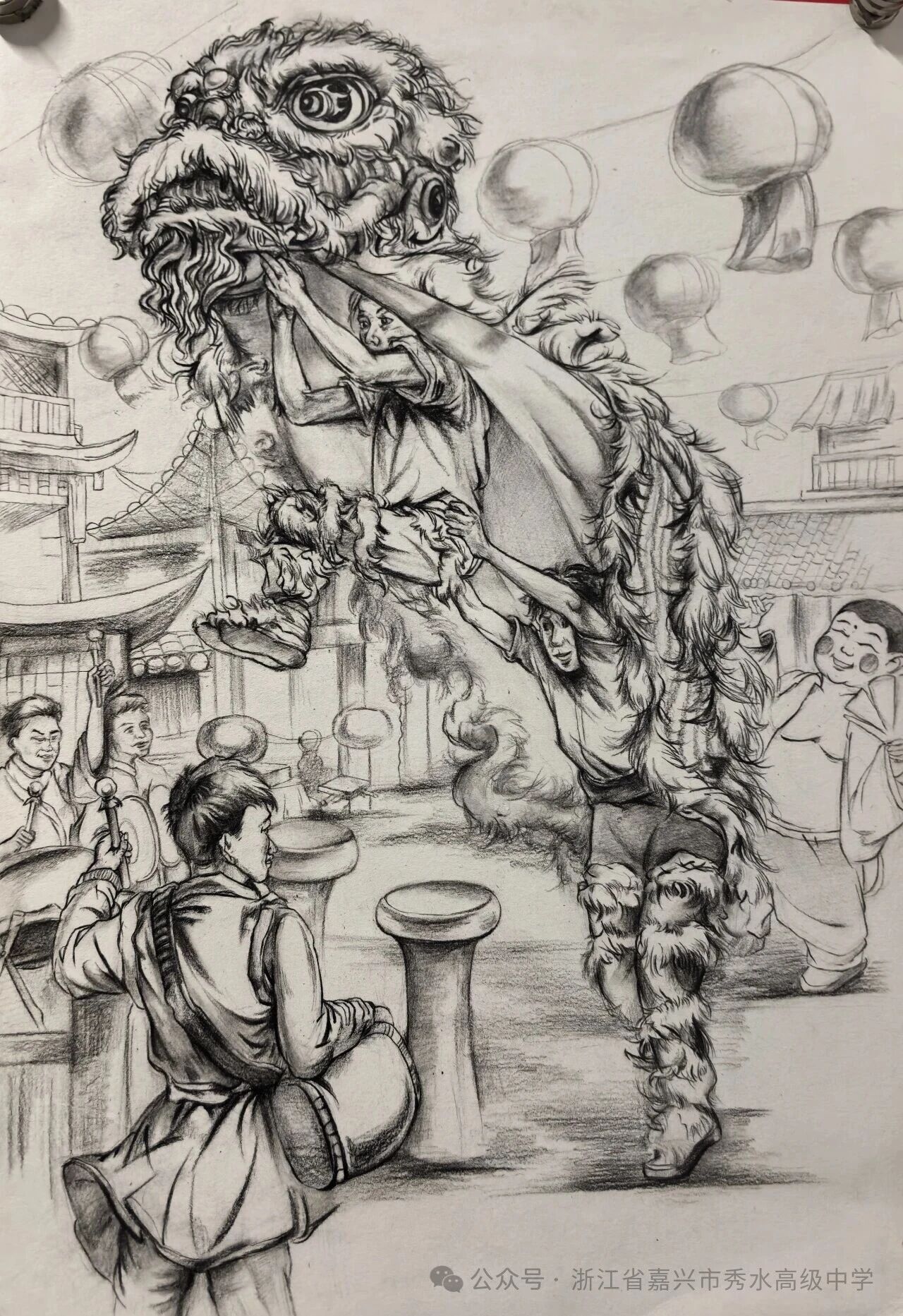 集市上热闹的人群、门前奔跑的幼童、跃动的舞狮少年……同学们以灵动的线条捕捉流动的年节场景,充满生活的呼吸感。这些作品仿佛时光的切片,生动记录着热闹与温馨交织的民间烟火。