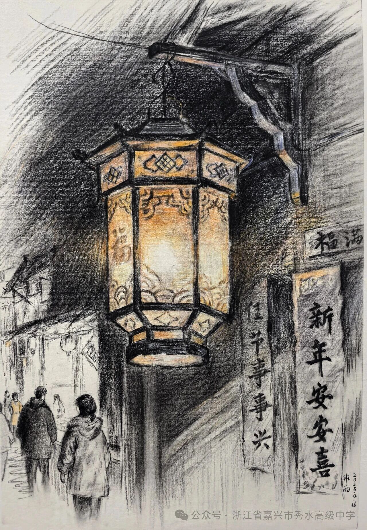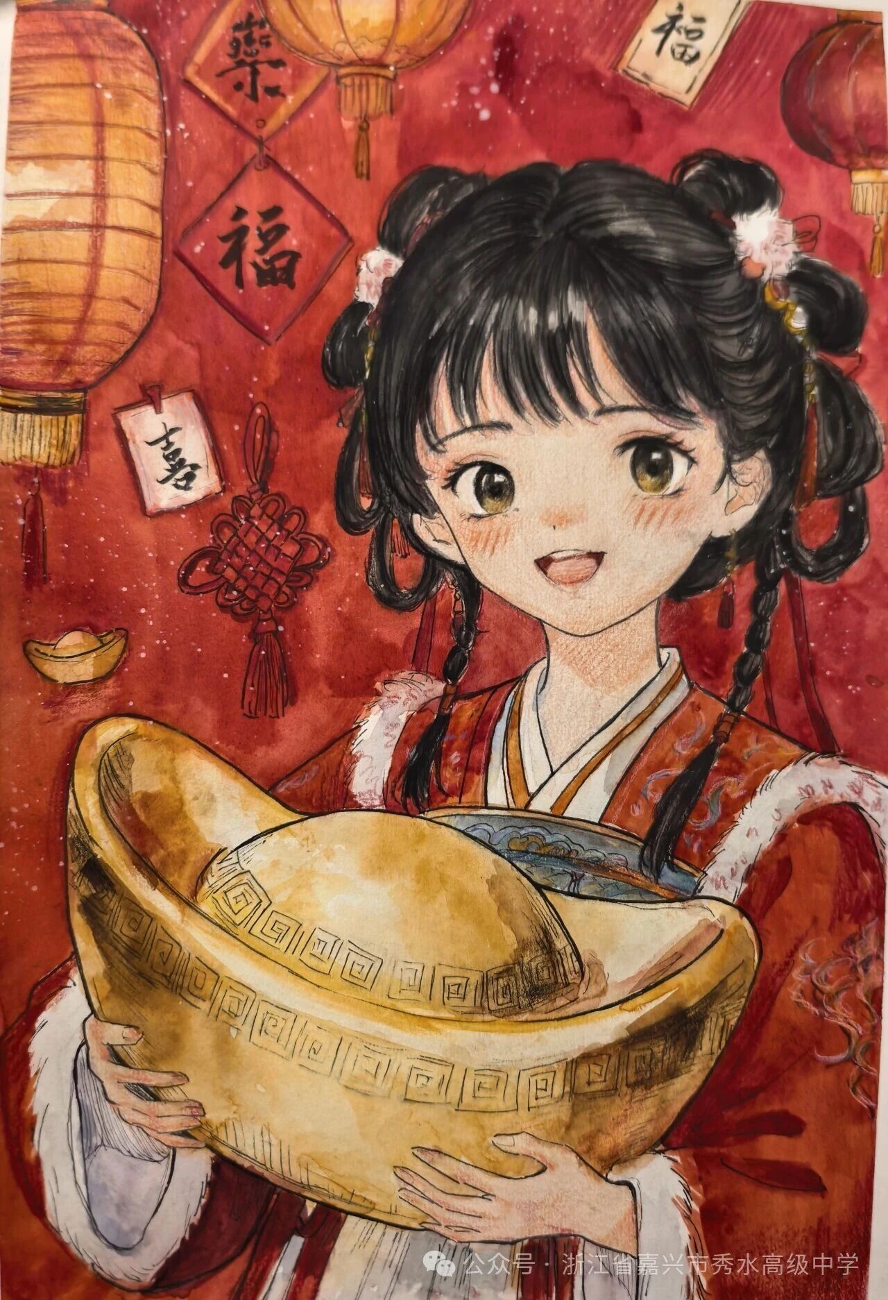 大红灯笼映照着雪色屋檐,少女怀拥硕大元宝,身后“福”“喜”高悬,中国结摇曳生姿,纯粹的喜悦与丰饶的祝愿扑面而来……同学们以饱满的色块、明快的对比,将新岁的喜庆、团聚的暖意凝固于画布之上。他们在光影交织中捕捉年味,也绘出了心中对生活最鲜亮的憧憬。