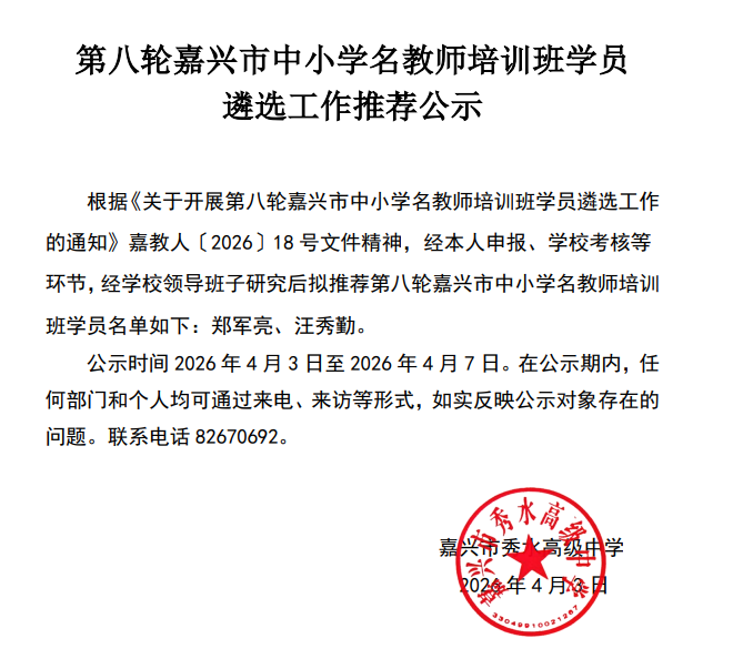 第八轮嘉兴市中小学名师培训班学院遴选工作推荐公示 - 通知公告 - 嘉兴市秀水高级中学